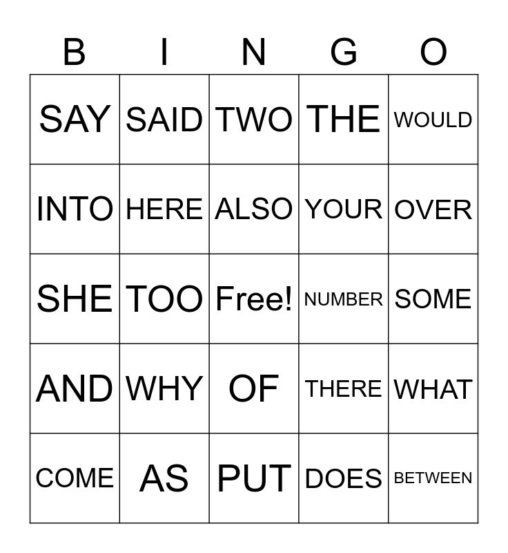 This bingo card has a free space and 24 words: WHY, AS, ALSO, COME, WOULD, SAY, INTO, SAID, NUMBER, OF, YOUR, SHE, THERE, WHAT, HERE, DOES, SOME, TWO, OVER, TOO, BETWEEN, AND, THE and PUT.