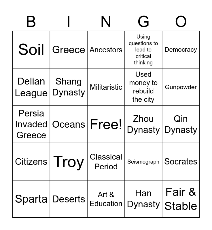 This bingo card has a free space and 30 words: Deserts, mountains, Oceans, Terrace farming, Soil, Ancestors, Shang Dynasty, Classical Period, Zhou Dynasty, Art & Education, Qin Dynasty, Fair & Stable, Han Dynasty, Inventions, Gunpowder, Silk, Seismograph, Citizens, Troy, Democracy, Persia Invaded Greece, Phalanx, Greece, Used money to rebuild the city, Delian League, Using questions to lead to critical thinking, Socrates, Sparta, Militaristic and Rhetoric.