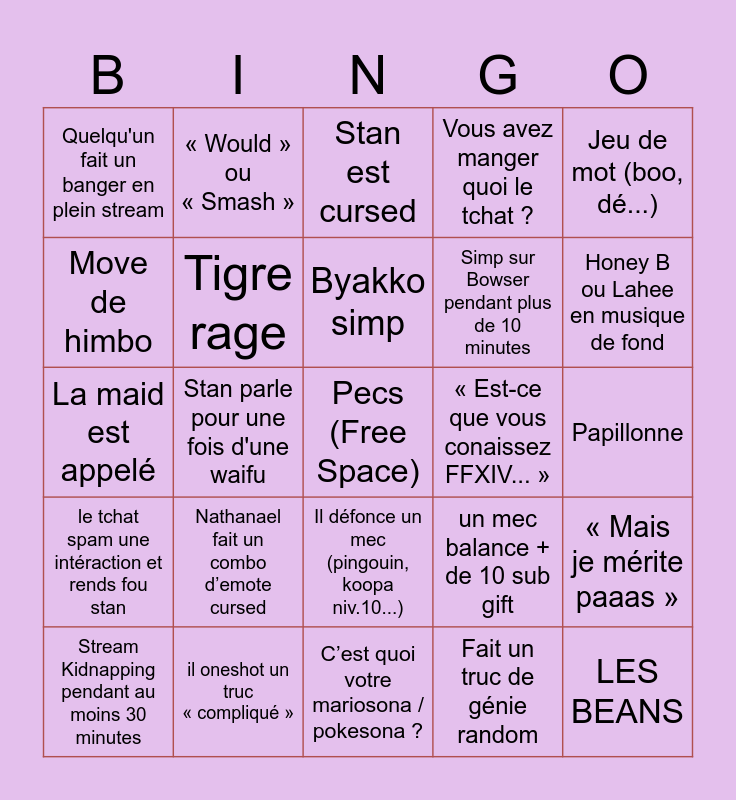 This bingo card has a free space and 28 words: « Mais je mérite paaas », Trouve un nouvel husbando, Simp sur Bowser pendant plus de 10 minutes, Fait un truc de génie random, Move de himbo, Stan est cursed, « Would » ou « Smash », le tchat spam une intéraction et rends fou stan, « Est-ce que vous conaissez FFXIV... », Stream Kidnapping pendant au moins 30 minutes, La maid est appelé, Vous avez manger quoi le tchat ?, il oneshot un truc « compliqué », C’est quoi votre mariosona / pokesona ?, Honey B ou Lahee en musique de fond, Il veut augmenter le prix des récompense, Nathanael fait un combo d’emote cursed, Tigre rage, Byakko simp, Il défonce un mec (pingouin, koopa niv.10...), Quelqu'un fait un banger en plein stream, Stan dit un truc de gauche, LES BEANS, Stan parle pour une fois d'une waifu, Papillonne, un mec balance + de 10 sub gift, Jeu de mot (boo, dé...) and "Monse", "Mario Jart", "STNA"....