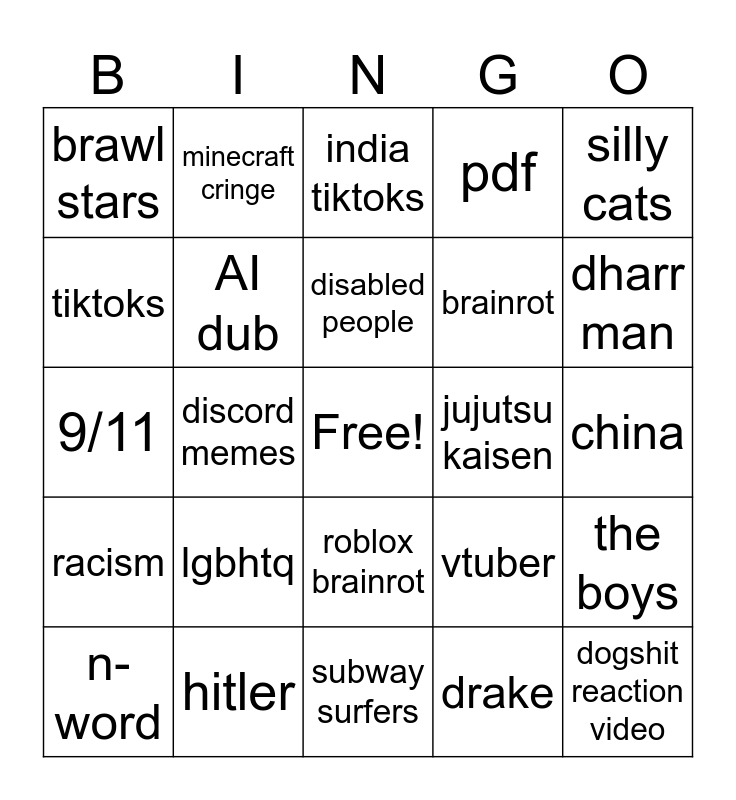 This bingo card has a free space and 24 words: lgbhtq, hitler, disabled people, n-word, silly cats, brawl stars, tiktoks, minecraft cringe, jujutsu kaisen, roblox brainrot, brainrot, 9/11, vtuber, the boys, AI dub, drake, china, india tiktoks, dharr man, discord memes, dogshit reaction video, racism, pdf and subway surfers.