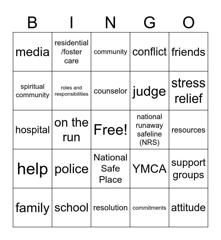 This bingo card has a free space and 24 words: police, school, counselor, family, friends, media, spiritual community, residential /foster care, national runaway safeline (NRS), National Safe Place, judge, hospital, YMCA, support groups, roles and responsibilities, commitments, resources, community, stress relief, on the run, attitude, help, conflict and resolution.