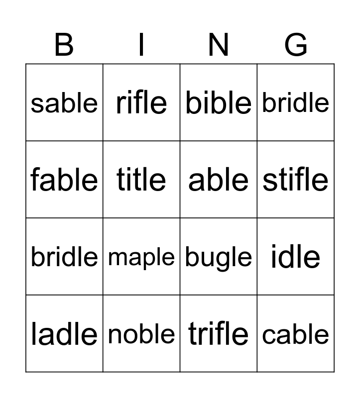 This bingo card has 20 words: idle, gable, bible, table, ladle, fable, noble, sable, bridle, rifle, maple, bugle, title, cable, able, cradle, stifle, bridle, trifle and staple.