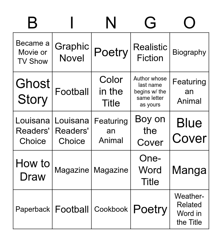 ⚠ This card has duplicate items: Girl on the Cover (2), Featuring an Animal (2), Paperback (2), Cookbook (2), Magazine (2), How to Draw (2), Graphic Novel (2), Love Story (2), Ghost Story (2), Vampire (2), Football (2), Realistic Fiction (2), Manga (2), One-Word Title (2), Blue Cover (2), Part of a Series (2), Color in the Title (2), Boy on the Cover (2), Weather-Related Word in the Title (2), Biography (2), Louisana Readers' Choice (2), Poetry (2), Became a Movie or TV Show (2), Author whose last name begins w/ the same letter as yours (2)