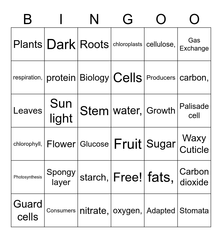 This bingo card has 36 words: Free!, starch,, oxygen,, respiration,, chlorophyll,, water,, protein, nitrate,, cellulose,, fats,, carbon,, chloroplasts, Carbon dioxide, Sun light, Cells, Plants, Photosynthesis, Growth, Leaves, Roots, Stem, Flower, Fruit, Glucose, Sugar, Dark, Producers, Consumers, Biology, Gas Exchange, Stomata, Guard cells, Waxy Cuticle, Palisade cell, Spongy layer and Adapted.