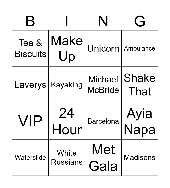 This bingo card has 20 words: Ayia Napa, Paintballing, Unicorn, Magazines, Waterslide, Laverys, White Russians, Tea & Biscuits, VIP, Make Up, 24 Hour, Barcelona, Kayaking, Madisons, Michael McBride, Sooty, Shake That, Ambulance, Met Gala and Follow Me.