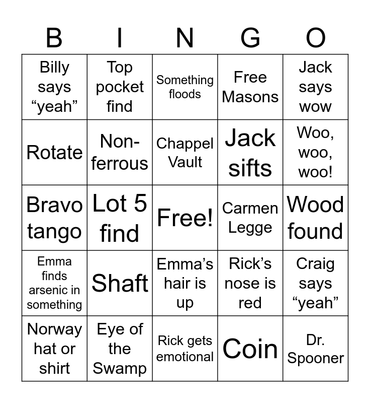 This bingo card has a free space and 24 words: Shaft, Eye of the Swamp, Chappel Vault, Norway hat or shirt, Jack says wow, Billy says “yeah”, Rotate, Top pocket find, Carmen Legge, Emma’s hair is up, Jack sifts, Bravo tango, Rick’s nose is red, Craig says “yeah”, Non-ferrous, Coin, Wood found, Something floods, Woo, woo, woo!, Lot 5 find, Dr. Spooner, Emma finds arsenic in something, Free Masons and Rick gets emotional.
