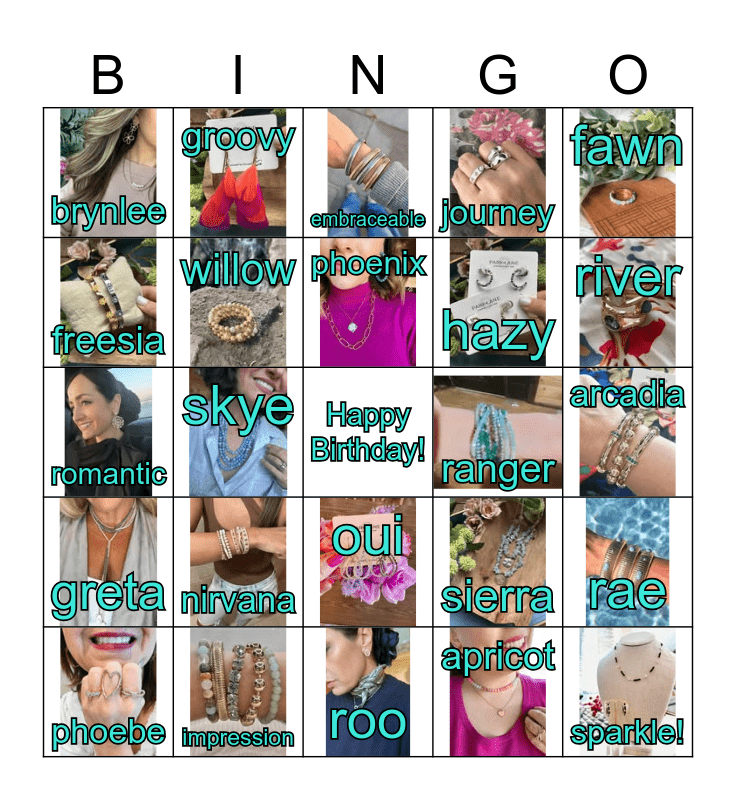 This bingo card has 24 images, a free space and 24 words: nirvana, impression, phoenix, phoebe, fawn, brynlee, freesia, groovy, ranger, oui, hazy, romantic, sierra, rae, willow, apricot, arcadia, embraceable, river, skye, sparkle!, greta, journey and roo.
