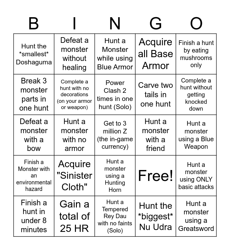 This bingo card has 25 words: Acquire "Sinister Cloth", Hunt a Tempered Rey Dau with no faints (Solo), Power Clash 2 times in one hunt (Solo), Finish a hunt in under 8 minutes, Finish a hunt by eating mushrooms only, Hunt the *smallest* Doshaguma, Break 3 monster parts in one hunt, Defeat a monster without healing, Hunt a monster with a friend, Hunt a monster using a Hunting Horn, Carve two tails in one hunt, Defeat a monster with a bow, Free!, Hunt a monster using ONLY basic attacks, Complete a hunt with no decorations (on your armor or weapon), Hunt a monster using a Greatsword, Hunt a monster using a Blue Weapon, Hunt a Monster while using Blue Armor, Complete a hunt without getting knocked down, Hunt a monster with no armor, Get to 3 million Z (the in-game currency), Gain a total of 25 HR, Finish a Monster with an environmental hazard, Acquire all Base Armor and Hunt the *biggest* Nu Udra.