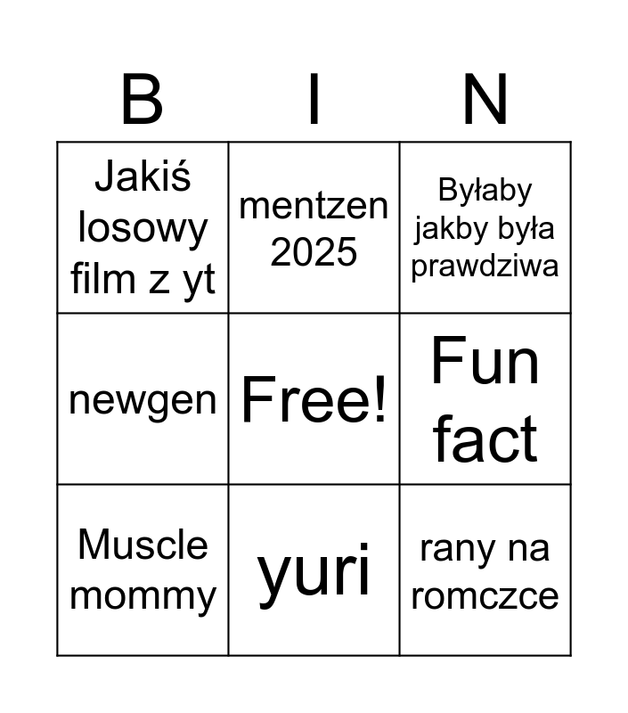 This bingo card has a free space and 8 words: Fun fact, Byłaby jakby była prawdziwa, mentzen 2025, Muscle mommy, Jakiś losowy film z yt, rany na romczce, newgen and yuri.