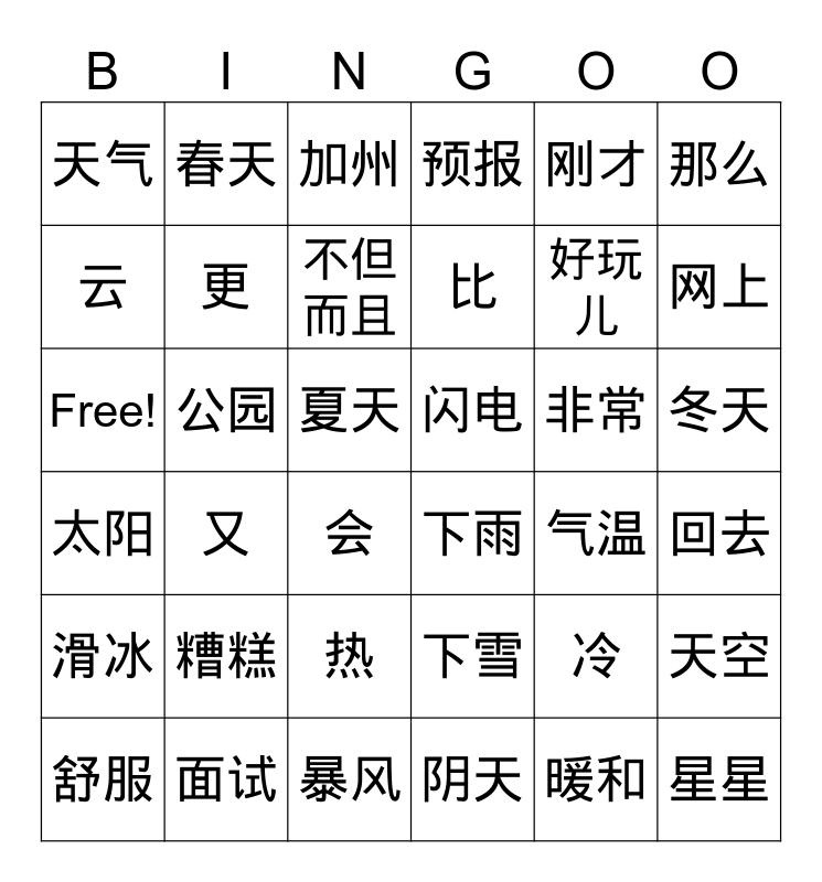 This bingo card has 36 words: 下雪, 热, 阴天, 云, 太阳, 闪电, 更, 暴风, 刚才, 冷, 网上, 预报, 天空, 公园, 比, 天气, 滑冰, 非常, Free!, 加州, 夏天, 又, 下雨, 会, 气温, 春天, 好玩儿, 面试, 不但而且, 那么, 星星, 舒服, 回去, 冬天, 糟糕 and 暖和.