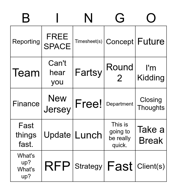 This bingo card has a free space and 44 words: Partner, Client(s), Creative, What's up? What's up?, Won, Fast, Timesheet(s), Budget, Future, RFP, Concept, Department, Lunch, Update, Planning, Strategy, Billed, Finance, Highlights, I'm Kidding, FREE SPACE, Process, But Seriously, Reporting, Brand, Closing Thoughts, Folks, Vision, This is going to be really quick., Fast things fast., Slow things slow., Take a Break, Wilmington, Philly, New Jersey, New Business, Barbara, Utilization, Fartsy, Team, Round 2, Zoom, Can't hear you and Mute.