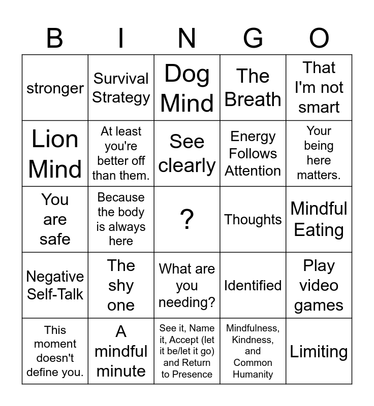 This bingo card has a free space and 24 words: The shy one, A mindful minute, See clearly, This moment doesn't define you., That I'm not smart, stronger, Lion Mind, Survival Strategy, Thoughts, What are you needing?, Energy Follows Attention, You are safe, Identified, Play video games, At least you're better off than them., Mindfulness, Kindness, and Common Humanity, Mindful Eating, Dog Mind, Your being here matters., Because the body is always here, Limiting, Negative Self-Talk, The Breath and See it, Name it, Accept (let it be/let it go) and Return to Presence.