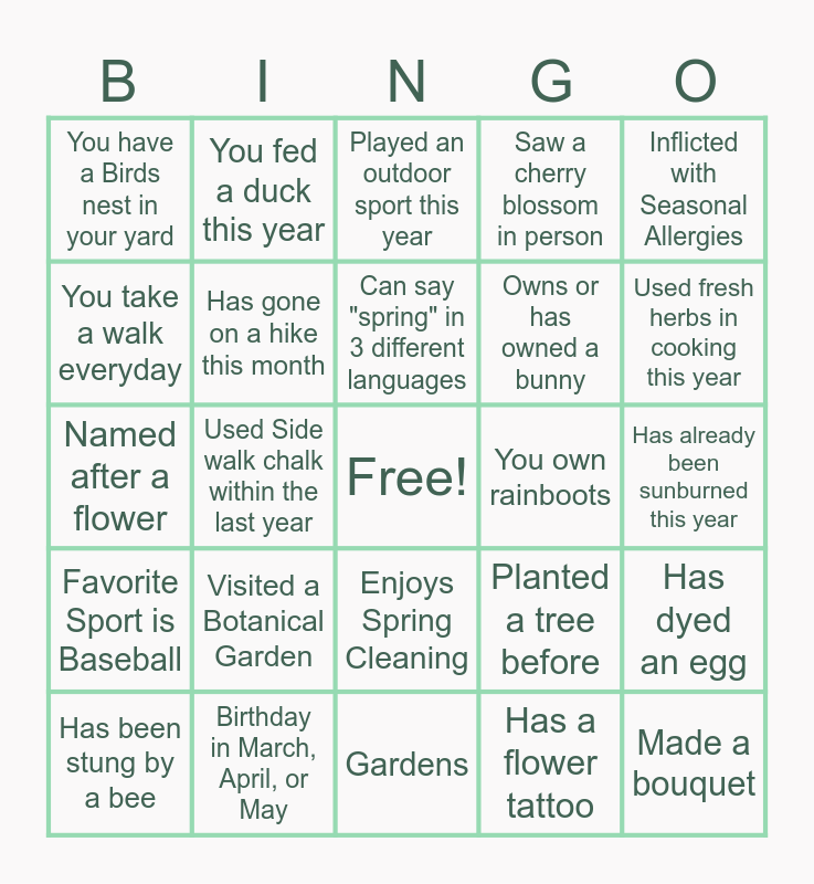This bingo card has a free space and 24 words: Visited a Botanical Garden, Birthday in March, April, or May, Can say "spring" in 3 different languages, Has been stung by a bee, Inflicted with Seasonal Allergies, You have a Birds nest in your yard, You take a walk everyday, You fed a duck this year, You own rainboots, Enjoys Spring Cleaning, Owns or has owned a bunny, Named after a flower, Planted a tree before, Has dyed an egg, Has gone on a hike this month, Has a flower tattoo, Has already been sunburned this year, Played an outdoor sport this year, Used fresh herbs in cooking this year, Used Side walk chalk within the last year, Made a bouquet, Favorite Sport is Baseball, Saw a cherry blossom in person and Gardens.