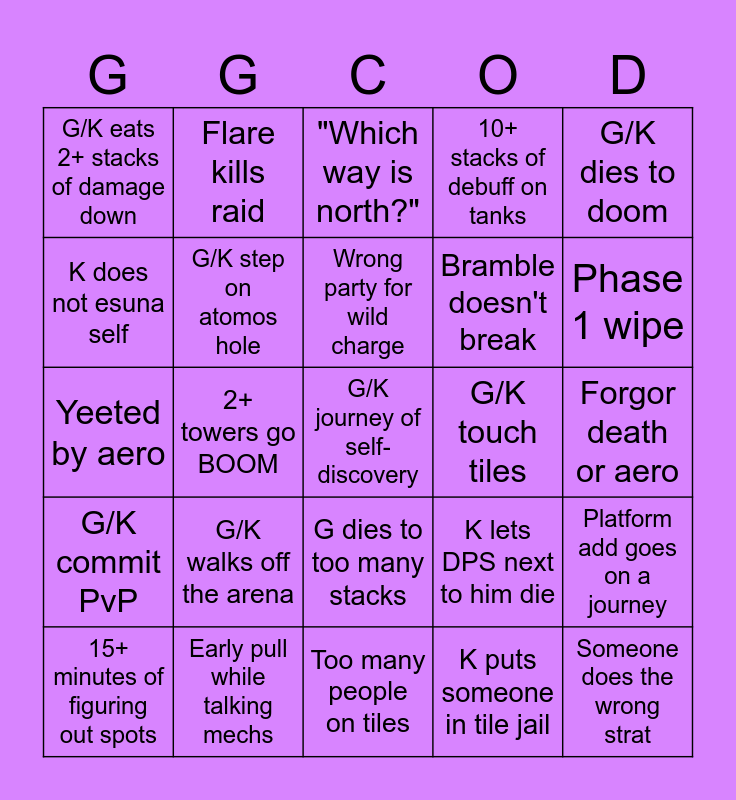 This bingo card has 35 words: G/K commit hand terrorism, Dies to aero exploding, Tank LB3 on towers, G/K step on atomos hole, G dies to too many stacks, 10+ stacks of debuff on tanks, K does not esuna self, ENRAGE, Wrong party for wild charge, Sucked in by death, Yeeted by aero, G/K dies to doom, Dies to bleed, G/K get stoned, G/K eats 2+ stacks of damage down, G/K touch tiles, K puts someone in tile jail, 2+ towers go BOOM, G/K commit PvP, G/K journey of self-discovery, K lets DPS next to him die, 15+ minutes of figuring out spots, Platform add goes on a journey, Early pull while talking mechs, "Which way is north?", Phase 1 wipe, Someone does the wrong strat, Wrong bramble tether, Bramble doesn't break, Forgor death or aero, Rogue chaser, Too many people on tiles, G/K walks off the arena, Flare kills raid and G/K get face lasered.
