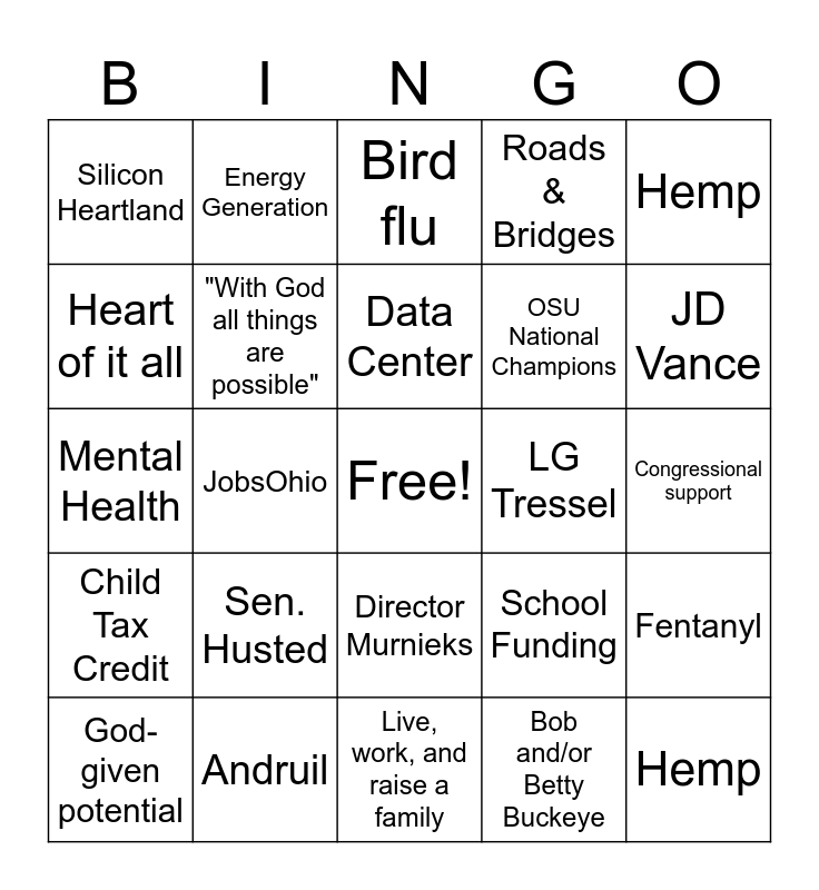 This bingo card has a free space and 32 words: Bob and/or Betty Buckeye, East Palestine, JobsOhio, Public-Private Partnership, Child Tax Credit, "With God all things are possible", Hemp, Fentanyl, Energy Generation, AI, Data Center, Bird flu, My bride Fran, For the children, LG Tressel, Imagination Library, God-given potential, Mental Health, Director Murnieks, Sen. Husted, School Funding, H2Ohio, Congressional support, Andruil, Hemp, Roads & Bridges, OSU National Champions, Heart of it all, Silicon Heartland, Live, work, and raise a family, Science of reading and JD Vance.