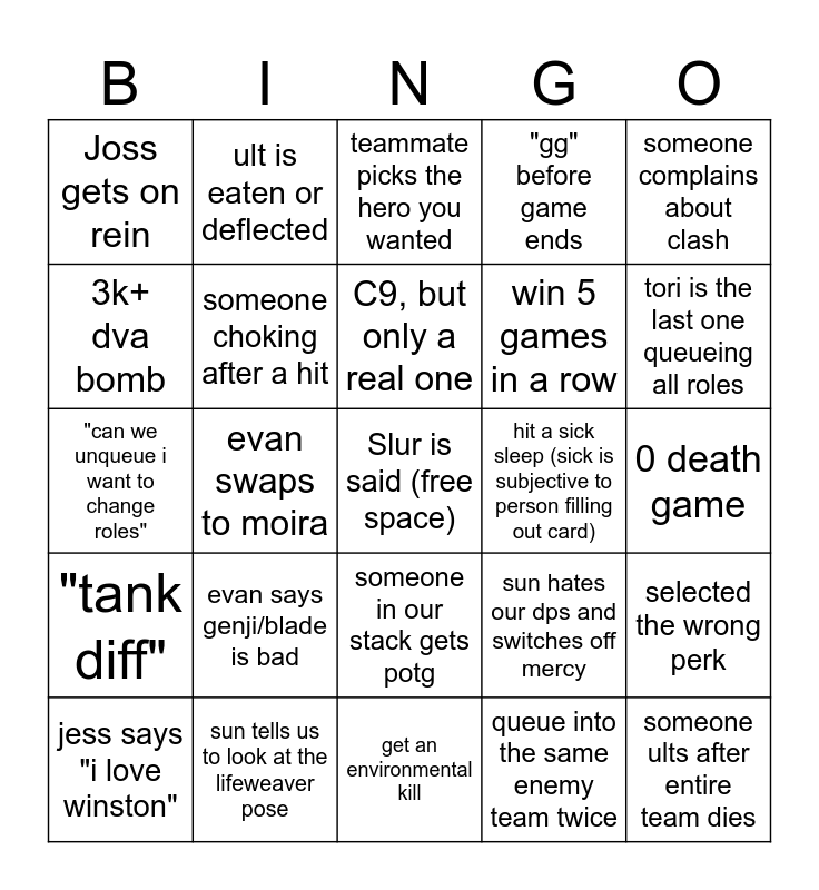 This bingo card has a free space and 24 words: jess says "i love winston", evan says genji/blade is bad, C9, but only a real one, queue into the same enemy team twice, someone complains about clash, Joss gets on rein, ult is eaten or deflected, teammate picks the hero you wanted, hit a sick sleep (sick is subjective to person filling out card), 0 death game, "can we unqueue i want to change roles", someone choking after a hit, sun hates our dps and switches off mercy, selected the wrong perk, 3k+ dva bomb, sun tells us to look at the lifeweaver pose, get an environmental kill, "gg" before game ends, tori is the last one queueing all roles, "tank diff", evan swaps to moira, someone in our stack gets potg, win 5 games in a row and someone ults after entire team dies.
