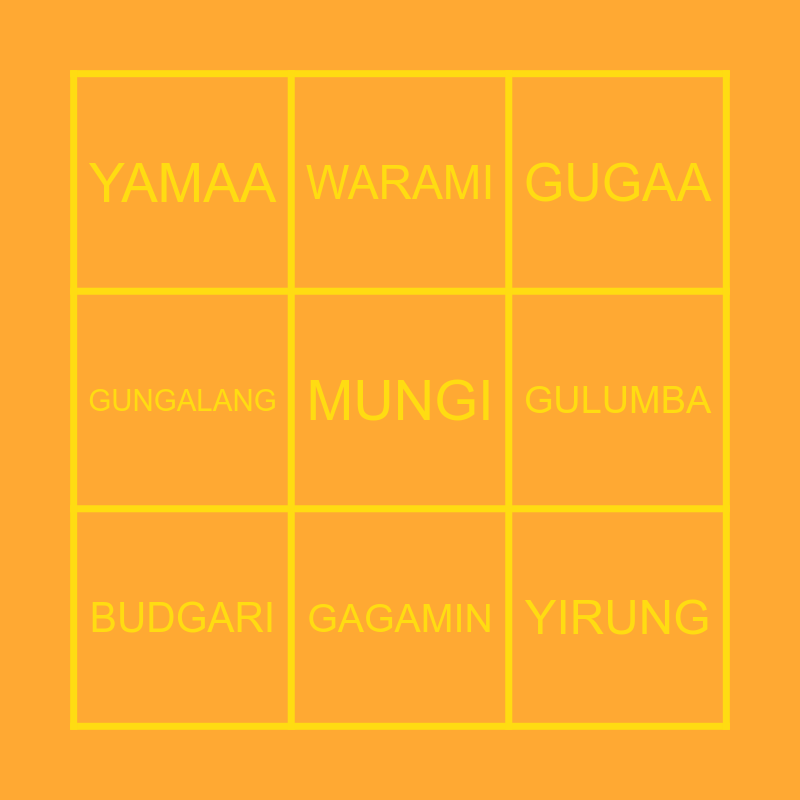 This bingo card has 21 words: DINEWAN, BUNDAA, GUGAA, THICKIPILLA, GUGUBURRA, WUMBAD, YAMAA, WARAMI, DIDJURIGURA, BUDGARI, MUNGI, GULUMBA, BIRAN, MIGAY, YIRUNG, BIRRANG, NGURAMBANG, DANGAA, GUNGALANG, GAGAMIN and YUYANG.
