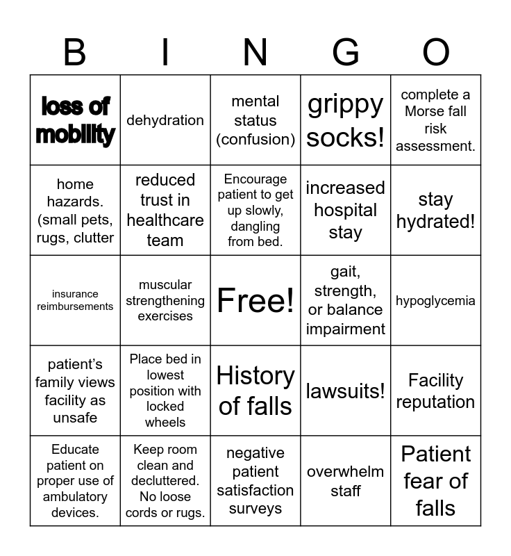 This bingo card has a free space and 24 words: Place bed in lowest position with locked wheels, Keep room clean and decluttered. No loose cords or rugs., Encourage patient to get up slowly, dangling from bed., Educate patient on proper use of ambulatory devices., complete a Morse fall risk assessment., loss of mobility, home hazards. (small pets, rugs, clutter, dehydration, gait, strength, or balance impairment, History of falls, increased hospital stay, insurance reimbursements, lawsuits!, Facility reputation, reduced trust in healthcare team, overwhelm staff, hypoglycemia, mental status (confusion), stay hydrated!, muscular strengthening exercises, Patient fear of falls, patient’s family views facility as unsafe, grippy socks! and negative patient satisfaction surveys.