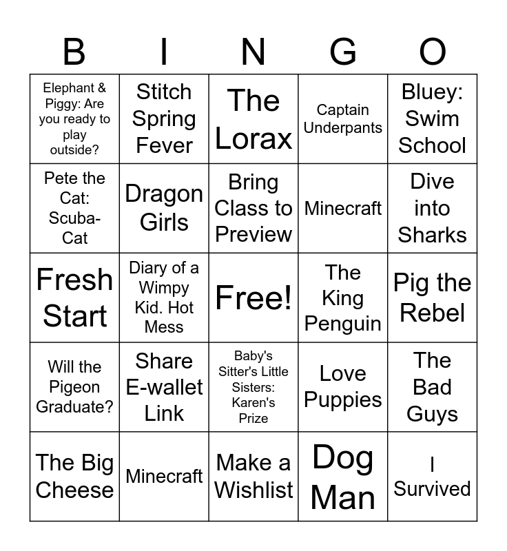 This bingo card has a free space and 25 words: Share E-wallet Link, Make a Wishlist, Bring Class to Preview, The Big Cheese, Bluey: Swim School, Elephant & Piggy: Are you ready to play outside?, Pete the Cat: Scuba- Cat, Stitch Spring Fever, The King Penguin, Baby's Sitter's Little Sisters: Karen's Prize, Minecraft, Fresh Start, Love Puppies, The Bad Guys, Dragon Girls, Around the Spider-Verse, Pig the Rebel, The Lorax, Dive into Sharks, Diary of a Wimpy Kid. Hot Mess, I Survived, Minecraft, Will the Pigeon Graduate?, Captain Underpants and Dog Man.