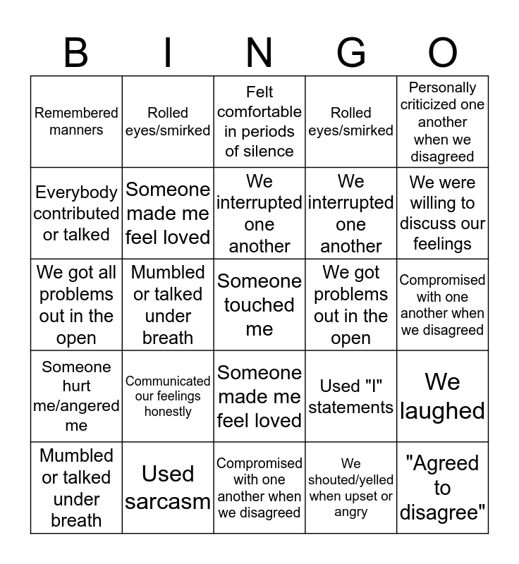 This bingo card has 42 words: One person spoke at a time, We interrupted one another, I felt heard, Communicated our feelings honestly, We shouted/yelled when upset or angry, We laughed, Someone touched me, Someone hurt me/angered me, Felt comfortable in periods of silence, Someone made me feel loved, Compromised with one another when we disagreed, We were willing to discuss our feelings, Mumbled or talked under breath, Personally criticized one another when we disagreed, Used sarcasm, Used "I" statements, Gestured or used body language to communicate, We got all problems out in the open, Worked toward a shared goal, Rolled eyes/smirked, Everybody contributed or talked, Talked over one another, "Agreed to disagree", Remembered manners, Felt disconnected, One person spoke at a time, We interrupted one another, Communicated our feelings honestly, We shouted when upset or angry, We laughed, I felt unsafe, Someone hurt me/angered me, Someone made me feel loved, Compromised with one another when we disagreed, We were willing to discuss our feelings, Mumbled or talked under breath, Used sarcasm, We got problems out in the open, I felt safe, Worked toward a shared goal, Rolled eyes/smirked and Everybody contributed or talked.