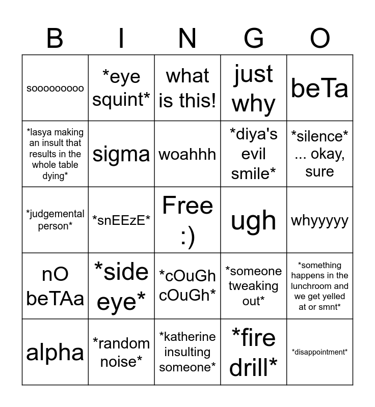 This bingo card has a free space and 39 words: AhHhh, Naurrr, uR sO fAt, sigma, alpha, *cOuGh cOuGh*, woahhh, sigma boys, beTa, nO beTAa, *snEEzE*, just why, *disappointment*, whyyyyy, ugh, *side eye*, *awkward silence*, sooooooooo, *hair flip*, *someone tweaking out*, *lasya making an insult that results in the whole table dying*, *katherine insulting someone*, *diya's evil smile*, *silence* ... okay, sure, you can go, *diya being goofy-ahh*, ur mom... ___, whaT!, i would/could never, *eye squint*, YOU LIKE ____!!!, ew, what is this!, *random noise*, *fire drill*, *random drill*, *something happens in the lunchroom and we get yelled at or smnt*, *judgemental person* and *mental*.