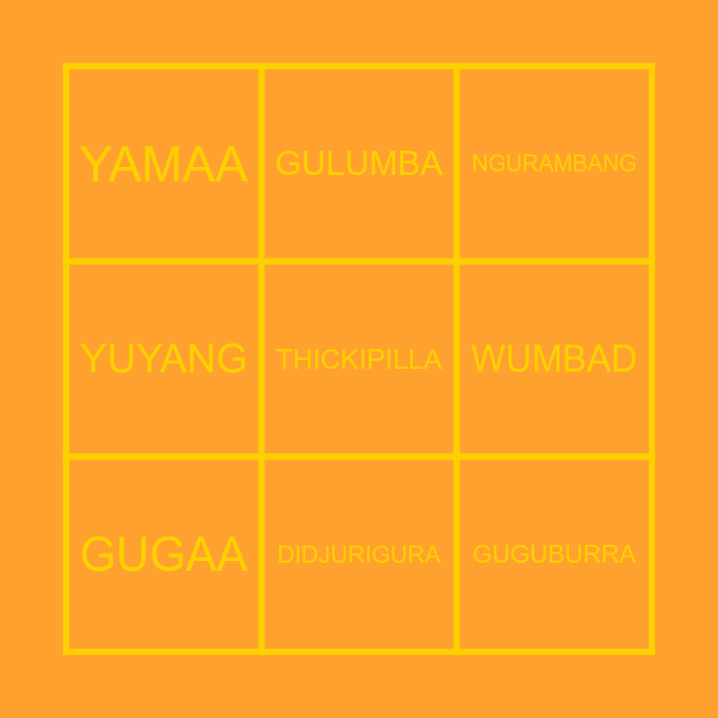This bingo card has 21 words: WARMI, GUNGALANG, NGURAMBANG, BIRAN, BUNDAA, BUGARI, YAMAA, GULUMBA, MUNGI, GUGAA, THICKIPILLA, WUMBAD, GAGAMIN, DINEWAN, GUGUBURRA, MIGAY, BIRRUNG, DANGAA, YUYANG, DIDJURIGURA and YIRUNG.