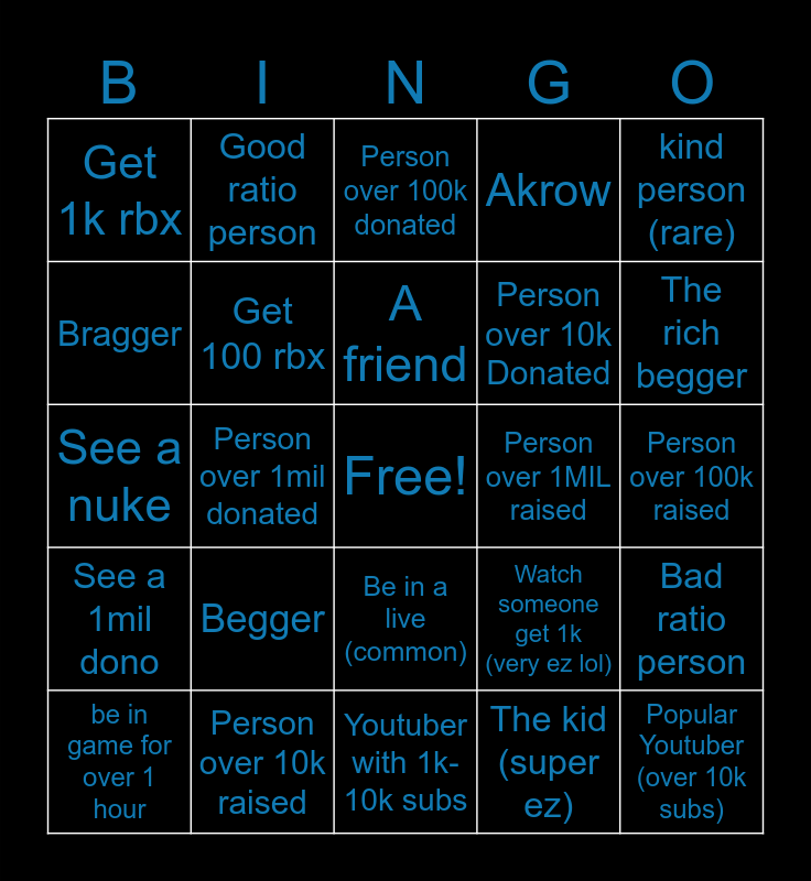 This bingo card has a free space and 24 words: Begger, Person over 10k raised, A friend, be in game for over 1 hour, kind person (rare), Get 1k rbx, Bragger, Good ratio person, Person over 1MIL raised, Be in a live (common), Person over 10k Donated, See a nuke, Watch someone get 1k (very ez lol), Bad ratio person, Get 100 rbx, The kid (super ez), Person over 100k raised, Person over 100k donated, The rich begger, Person over 1mil donated, Popular Youtuber (over 10k subs), See a 1mil dono, Akrow and Youtuber with 1k-10k subs.