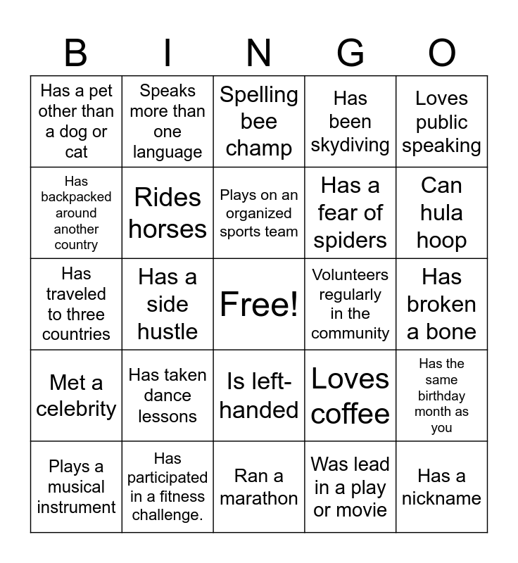 This bingo card has a free space and 24 words: Has taken dance lessons, Has participated in a fitness challenge., Plays on an organized sports team, Plays a musical instrument, Loves public speaking, Has a pet other than a dog or cat, Has backpacked around another country, Speaks more than one language, Volunteers regularly in the community, Is left-handed, Has a fear of spiders, Has traveled to three countries, Loves coffee, Has the same birthday month as you, Rides horses, Was lead in a play or movie, Has broken a bone, Spelling bee champ, Can hula hoop, Has a side hustle, Has a nickname, Met a celebrity, Has been skydiving and Ran a marathon.