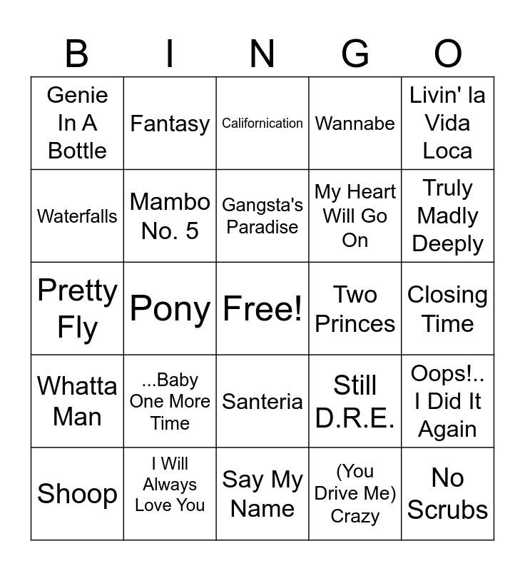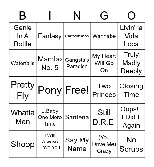 This bingo card has a free space and 50 words: Bye Bye Bye, No Scrubs, I Want It That Way, Say My Name, ...Baby One More Time, It's Gonna Be Me, Fantasy, Maria Maria, Waterfalls, Come On Over Baby, Mambo No. 5, Wannabe, Oops!.. I Did It Again, Still D.R.E., Be My Lover, Zombie, Gangsta's Paradise, Two Princes, Smooth, Livin' la Vida Loca, Pony, (You Drive Me) Crazy, Genie In A Bottle, My Heart Will Go On, Men In Black, Tearin' Up My Heart, Truly Madly Deeply, Kiss Me, Californication, Santeria, Jump, Steal My Sunshine, Thank You, She's So High, I Will Always Love You, Cherry Pie, I Wanna Dance With Somebody, Ice Ice Baby, You Can't Touch This, Closing Time, Tubthumping, Cotton Eye Joe, You Oughta Know, Man! I Feel Like A Women, Shoop, Pretty Fly, What Is Love, Lovefool, Whatta Man and Believe.