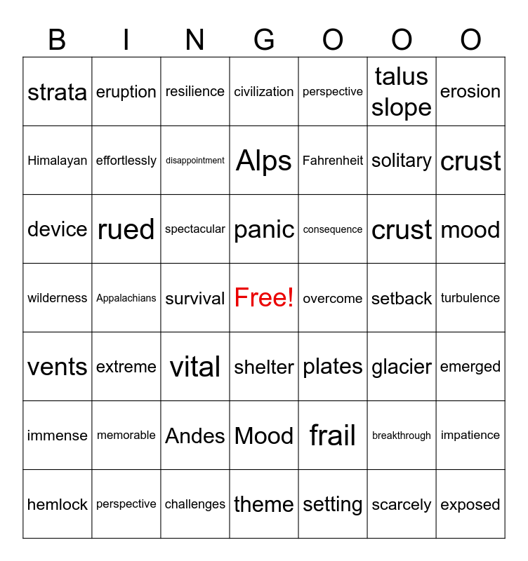 This bingo card has a free space and 48 words: frail, solitary, theme, Appalachians, spectacular, turbulence, eruption, perspective, talus slope, shelter, erosion, civilization, crust, consequence, immense, setback, Himalayan, crust, breakthrough, perspective, Fahrenheit, survival, strata, effortlessly, impatience, disappointment, mood, hemlock, panic, rued, scarcely, overcome, emerged, memorable, wilderness, plates, glacier, device, vital, Andes, vents, exposed, resilience, challenges, Alps, Mood, extreme and setting.