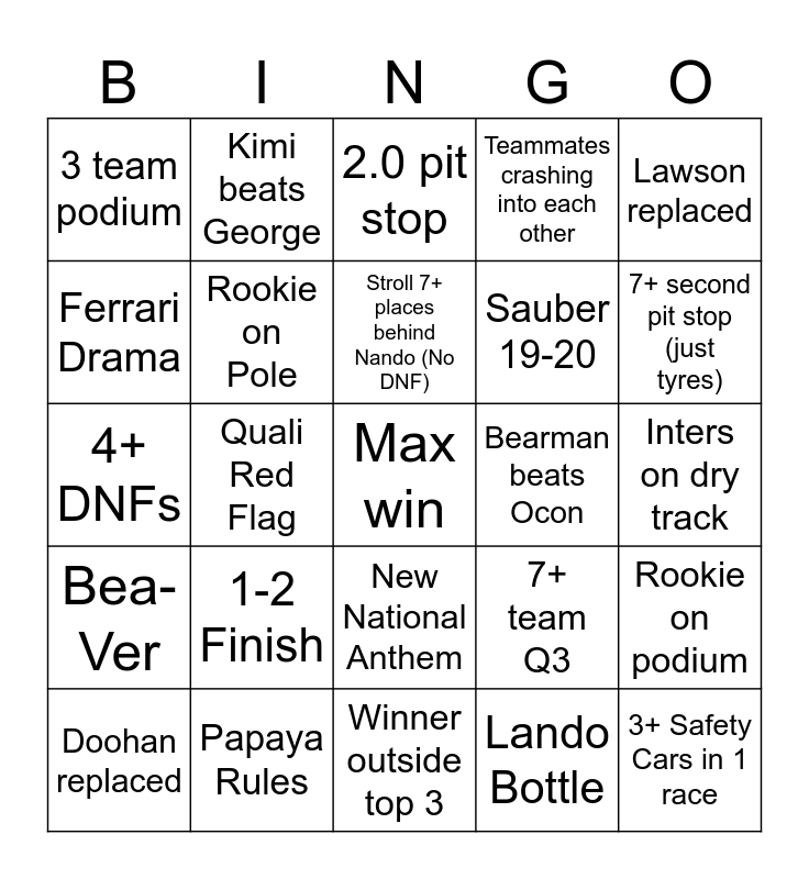 This bingo card has a free space and 24 words: 1-2 Finish, Papaya Rules, Stroll 7+ places behind Nando (No DNF), Doohan replaced, Lawson replaced, 3 team podium, Ferrari Drama, Kimi beats George, Bearman beats Ocon, New National Anthem, Sauber 19-20, 4+ DNFs, 7+ team Q3, Rookie on podium, Rookie on Pole, Lando Bottle, Inters on dry track, 2.0 pit stop, 7+ second pit stop (just tyres), Quali Red Flag, 3+ Safety Cars in 1 race, Bea-Ver, Teammates crashing into each other and Winner outside top 3.