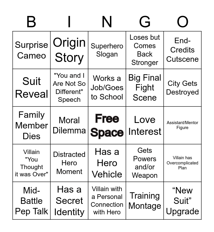 This bingo card has a free space and 24 words: Distracted Hero Moment, Has a Secret Identity, Works a Job/Goes to School, Mid-Battle Pep Talk, End-Credits Cutscene, Surprise Cameo, Suit Reveal, Origin Story, Love Interest, Has a Hero Vehicle, Big Final Fight Scene, Family Member Dies, Gets Powers and/or Weapon, Villain has Overcomplicated Plan, "You and I Are Not So Different" Speech, Training Montage, Assistant/Mentor Figure, Superhero Slogan, City Gets Destroyed, Moral Dilemma, “New Suit” Upgrade, Villain "You Thought it was Over", Loses but Comes Back Stronger and Villain with a Personal Connection with Hero.