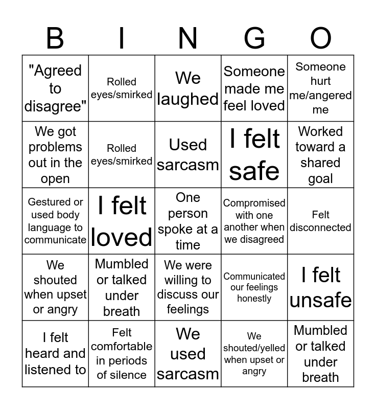 This bingo card has 43 words: Free!, One person spoke at a time, We interrupted one another, I felt heard and listened to, I communicated my feelings honestly, We shouted/yelled when upset or angry, We laughed, Someone touched me, Someone hurt me/angered me, Felt comfortable in periods of silence, Someone made me feel loved, Compromised with one another when we disagreed, We were willing to discuss our feelings, Mumbled or talked under breath, We personally criticized one another when we disagreed, We used sarcasm, Used "I" statements, Gestured or used body language to communicate, We got all problems out in the open, Worked toward a shared goal, Rolled eyes/smirked, Everybody contributed or talked, Talked over one another, "Agreed to disagree", Remembered manners, Felt disconnected, One person spoke at a time, We interrupted one another, Communicated our feelings honestly, We shouted when upset or angry, We laughed, I felt unsafe, I felt hurt or angry, I felt loved, Compromised with one another when we disagreed, We were willing to discuss our feelings, Mumbled or talked under breath, Used sarcasm, We got problems out in the open, I felt safe, Worked toward a shared goal, Rolled eyes/smirked and Everybody contributed or talked.