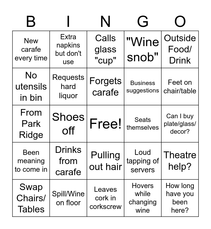 This bingo card has a free space and 24 words: Drinks from carafe, Spill/Wine on floor, Forgets carafe, Swap Chairs/ Tables, Outside Food/ Drink, New carafe every time, No utensils in bin, Extra napkins but don't use, Seats themselves, Pulling out hair, Business suggestions, From Park Ridge, Loud tapping of servers, Theatre help?, Requests hard liquor, Hovers while changing wine, Can I buy plate/glass/ decor?, Calls glass "cup", Feet on chair/table, Shoes off, How long have you been here?, Been meaning to come in, "Wine snob" and Leaves cork in corkscrew.