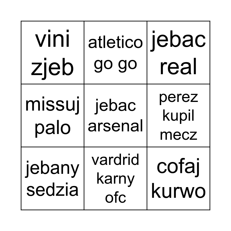 This bingo card has a free space and 8 words: perez kupil mecz, jebac real, atletico go go, jebany sedzia, vini zjeb, cofaj kurwo, missuj palo and vardrid karny ofc.