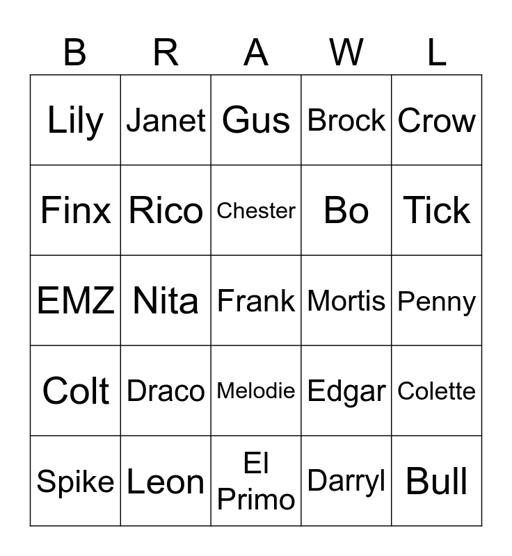 This bingo card has a free space and 24 words: Draco, Leon, Chester, Spike, Crow, Lily, Finx, Janet, Mortis, Melodie, Bo, EMZ, Edgar, Colette, Rico, Darryl, Penny, Gus, Tick, Nita, Bull, Colt, Brock and El Primo.