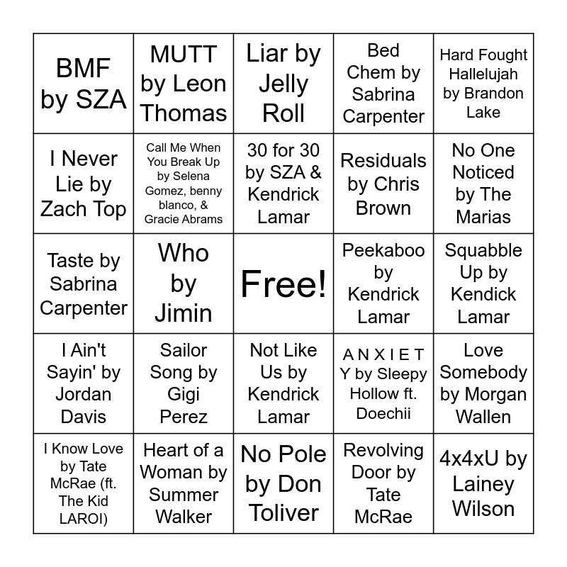 This bingo card has a free space and 88 words: Luther by Kendrick Lamar & SZA, Die With a Smile by Bruno Mars & Lady Gaga, Not Like Us by Kendrick Lamar, TV Off by Kendrick Lamar, A Bar Song by Shaboozey, APT. by Bruno Mars & ROSE, Birds of a Feather by Billie Eilish, Pink Pony Club by Chappell Roan, Lose Control by Teddy Swims, NOKIA by Drake, That's So True by Gracie Abrams, Beautiful Things by Benson Boone, Love Somebody by Morgan Wallen, Squabble Up by Kendick Lamar, I Had Some Help by Morgan Wallen & Post Malone, 30 for 30 by SZA & Kendrick Lamar, I'm the Problem by Morgan Wallen, Espresso by Sabrina Carpenter, Timeless by the Weeknd & Playboi Carti, Messy by Lola Young, Sports Car by Tate McRae, Denial is a River by Doechii, Taste by Sabrina Carpenter, Too Sweet by Hozier, Revolving Door by Tate McRae, All the Stars by Kendrick Lamar & SZA, Good Luck, Babe! by Chappell Roan, Stargazing by Myles Smith, Abracadabra by Lady Gaga, DTMF by Bad Bunny, Liar by Jelly Roll, Bed Chem by Sabrina Carpenter, High Road by Koe Wetzel & Jessie Murph, Die Trying by PARTYNEXDOOR & Drake, Sailor Song by Gigi Perez, I Never Lie by Zach Top, BMF by SZA, Gimme a Hug by Drake, I'm Gonna Love You by Cody Johnson & Carrie Underwood, No One Noticed by The Marias, Who by Jimin, Please Please Please by Sabrina Carpenter, Sorry I'm Here for Someone Else by Benson Boone, A N X I E T Y by Sleepy Hollow ft. Doechii, Peekaboo by Kendrick Lamar, Whatchu Kno About Me by GloRilla & Sexyy Red, Wildflower by Billie Eilish, Indigo by Sam Barber ft. Avery Anna, Smile by Morgan Wallen, Residuals by Chris Brown, Sticky by Tyler the Creator ft. GloRilla, Sexyy Red, and Lil Wayne, Cry for Me by The Weeknd, Bad Dreams by Teddy Swims, Good News by Shaboozey, Ms. Whitman by Bhad Bhabie, Tweaker by GELO, I Ain't Sayin' by Jordan Davis, MUTT by Leon Thomas, Worst Way by Riley Green, Busy Woman by Sabrina Carpenter, Somebody Loves Me by PARTYNEXTDOOR & Drake, Ordinary by Alex Warren, Am I Okay? by Megan Moroney, Fat Juicy & Wet by Sexyy Red & Bruno Mars, Like Him by Tyler the Creator, Heart of a Woman by Summer Walker, Dear God by Tate McRae, Call Me When You Break Up by Selena Gomez, benny blanco, & Gracie Abrams, I Know Love by Tate McRae (ft. The Kid LAROI), 4x4xU by Lainey Wilson, Purple Lace Bra by Tate McRae, Miss Possessive by Tate McRae, cLOUDs by J. Cole, Hard Fought Hallelujah by Brandon Lake, CN Tower by PARTYNEXTDOOR & Drake, Little Things by Ella Mai, Backseat Driver by Kane Brown, Headlock by Imogen Heap, No Pole by Don Toliver, The Largest by BigXthaPlug, Something About You by PARTYNEXTDOOR & Drake, Burning Down by Alex Warren, Push 2 Start by Tyla, Are You Even Real by Teddy Swims & GIVEON, Born Again by LISA (ft. Doja Cat & RAYE), Twenties by GIVEON, Deeper by PARTYNEXTDOR and Holy Smokes by Bailey Zimmerman.