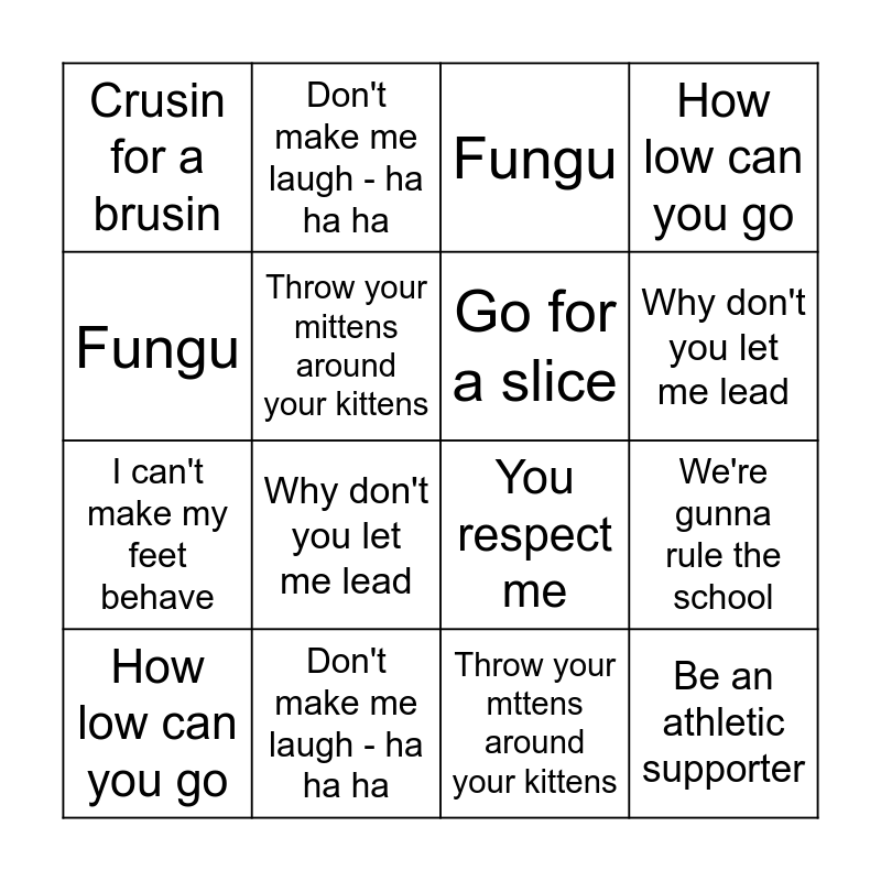⚠ This card has duplicate items: License Plate - DXJ432 (2), Life isn't fair (2), We're gunna rule the school (2), Be an athletic supporter (2), Crusin for a brusin (2), Fungu (2), Go for a slice (2), Bought it when I was in the 7th Grade (2), Don't make me laugh - ha ha ha (2), How low can you go (2), You respect me (2), Bun in the oven (2), Why don't you let me lead (2)