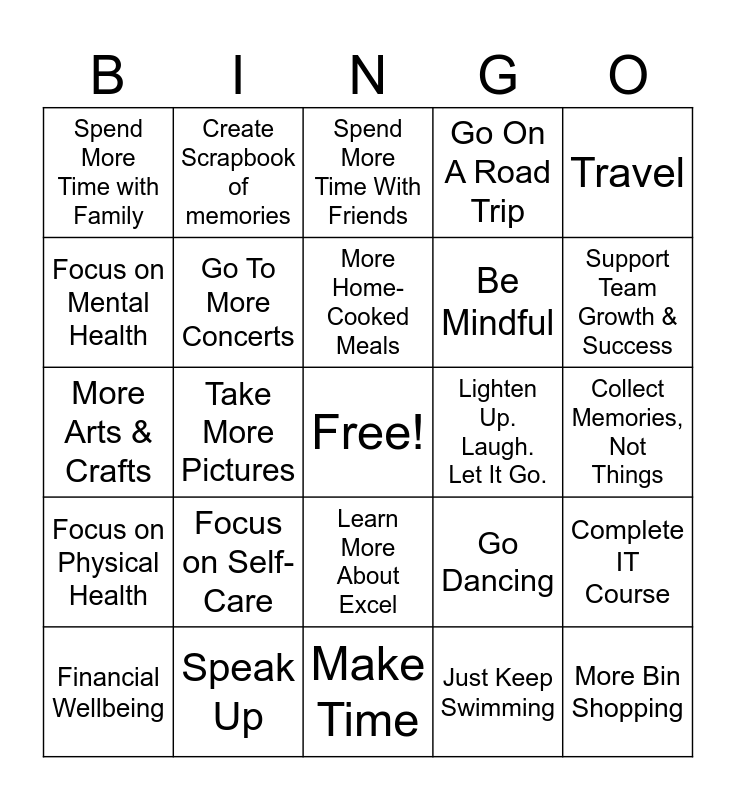 This bingo card has a free space and 24 words: Focus on Self-Care, Speak Up, More Home-Cooked Meals, Financial Wellbeing, Travel, Spend More Time with Family, Focus on Mental Health, Create Scrapbook of memories, Lighten Up. Laugh. Let It Go., Learn More About Excel, Be Mindful, More Arts & Crafts, Go Dancing, Complete IT Course, Go To More Concerts, Just Keep Swimming, Collect Memories, Not Things, Spend More Time With Friends, Support Team Growth & Success, Take More Pictures, More Bin Shopping, Focus on Physical Health, Go On A Road Trip and Make Time.