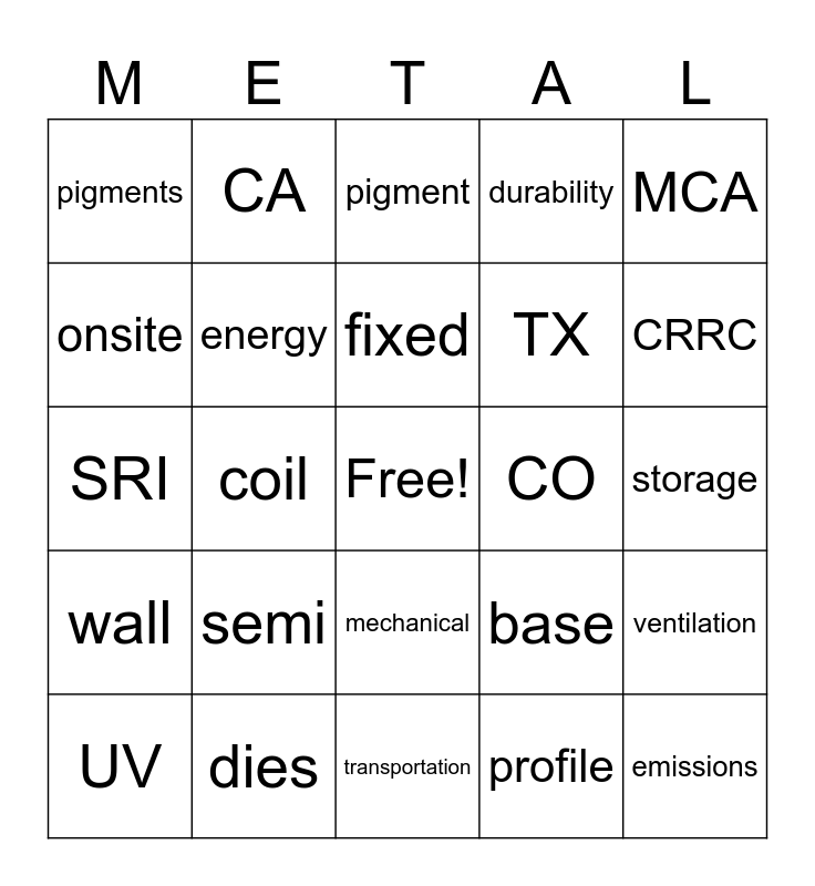 This bingo card has a free space and 66 words: length, flat, metal, ventilation, thermal, 40%, CA, carbon, fixed, US, mechanical, white, storage, MCA, carbon, onsite, coil, pigments, cool, TX, semi, wall, durability, EPD, OH, life cycle, roll former, steel, emissions, snap, UV, foot print, sustainability, GA, base, dies, roof, SRI, profile, strength, energy, 75%, CO, cost, waste, color, CRRC, fabricators, IL, recycle, jobsite, aluminum, EAF, flush, batten, FL, durability, secondary, pigment, transportation, flexibility, refelctance, CCS, integrity, low slope and wind.