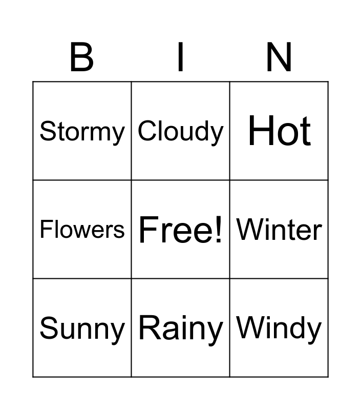 This bingo card has a free space and 15 words: Foggy, Cold, Hot, Stormy, Rainy, Windy, Chilly, Summer, Winter, Spring, Autumn, Flowers, Sunny, Cloudy and Snowy.