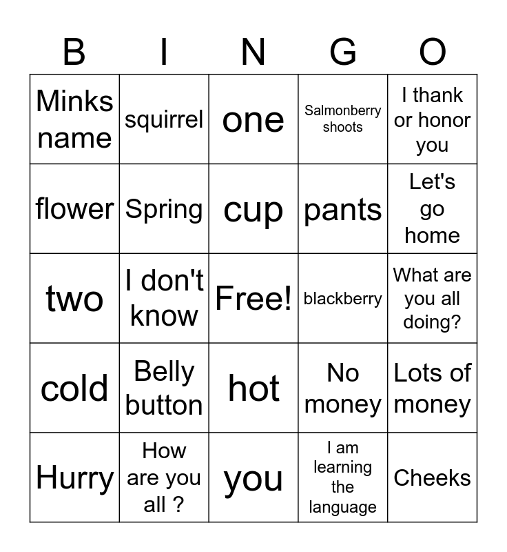 This bingo card has a free space and 47 words: Can you help me, Cheeks, aunt/uncle, you, Belly button, Shake your bushy tail, squirrel, What are you doing?, flower, Come here, Spring, Salmonberry shoots, Lots of money, No money, fork, plate, cup, blackberry, Im sorry, I thank or honor you, I don't know, I am learning the language, Minks name, pants, socks, Let's go home, Hurry, sweet, hot, cold, small, tea, sugar, spoon, How are you, How are you all ?, What are you all doing?, I am tired, I am happy, sunshine, rain, one, two, three, One hundred, Strong mind and Strong.