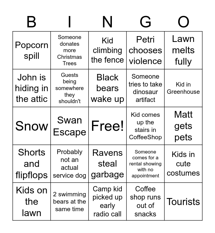This bingo card has a free space and 29 words: Kids on the lawn, Kid on a leash, Swan Escape, Wolverine Kit Sighting, Popcorn spill, Kid climbing the fence, Guests being somewhere they shouldn't, Probably not an actual service dog, Kid comes up the stairs in CoffeeShop, 2 swimming bears at the same time, Matt gets pets, Tourists, Camp kid picked up early radio call, Coffee shop runs out of snacks, Kid in Greenhouse, Petting zoo goats being naughty (Tyson), Ravens steal garbage, Shorts and flipflops, Lawn melts fully, Snow, Someone comes for a rental showing with no appointment, Screaming for more than 30 seconds straight, Someone tries to take dinosaur artifact, John is hiding in the attic, Petri chooses violence, Someone donates more Christmas Trees, Kids in cute costumes, Black bears wake up and Pablo goes over 50% hay coverage.