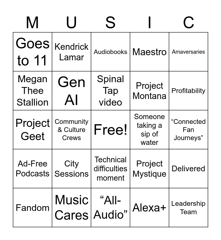 This bingo card has a free space and 24 words: City Sessions, Music Cares, Spinal Tap video, Fandom, Amaversaries, Goes to 11, Megan Thee Stallion, Kendrick Lamar, Someone taking a sip of water, Technical difficulties moment, Project Montana, Project Geet, Project Mystique, Delivered, Gen AI, Alexa+, “Connected Fan Journeys”, Audiobooks, Profitability, Community & Culture Crews, Leadership Team, Ad-Free Podcasts, Maestro and “All-Audio”.