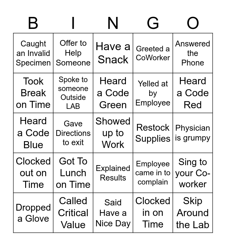 This bingo card has a free space and 24 words: Got To Lunch on Time, Called Critical Value, Heard a Code Green, Dropped a Glove, Answered the Phone, Caught an Invalid Specimen, Took Break on Time, Offer to Help Someone, Restock Supplies, Explained Results, Yelled at by Employee, Heard a Code Blue, Employee came in to complain, Sing to your Co-worker, Spoke to someone Outside LAB, Clocked in on Time, Physician is grumpy, Have a Snack, Heard a Code Red, Gave Directions to exit, Skip Around the Lab, Clocked out on Time, Greeted a CoWorker and Said Have a Nice Day.