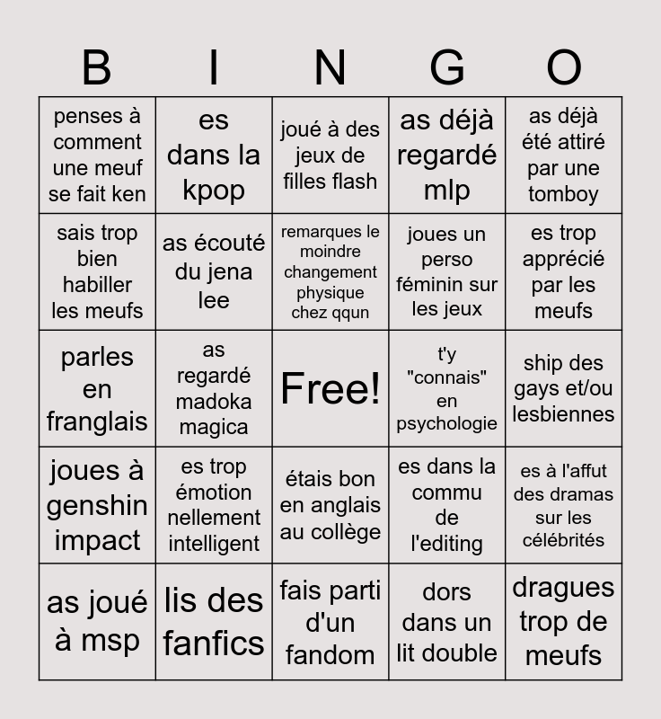 This bingo card has a free space and 29 words: as joué à msp, as regardé les winx, as regardé madoka magica, as regardé/joué à amour sucré, penses à comment une meuf se fait ken, joué à des jeux de filles flash, as écouté du jena lee, es trop émotion nellement intelligent, t'y "connais" en psychologie, lis des fanfics, ship des gays et/ou lesbiennes, dragues trop de meufs, fais parti d'un fandom, dors dans un lit double, es trop apprécié par les meufs, ranges bien ta chambre/ton appart, étais bon en anglais au collège, joues à genshin impact, as déjà été attiré par une tomboy, parles en franglais, es dans la commu de l'editing, as la monster comme boisson pref, joues un perso féminin sur les jeux, sais trop bien habiller les meufs, as déjà regardé mlp, es dans la kpop, es à l'affut des dramas sur les célébrités, remarques le moindre changement physique chez qqun and réponds à des bingos.