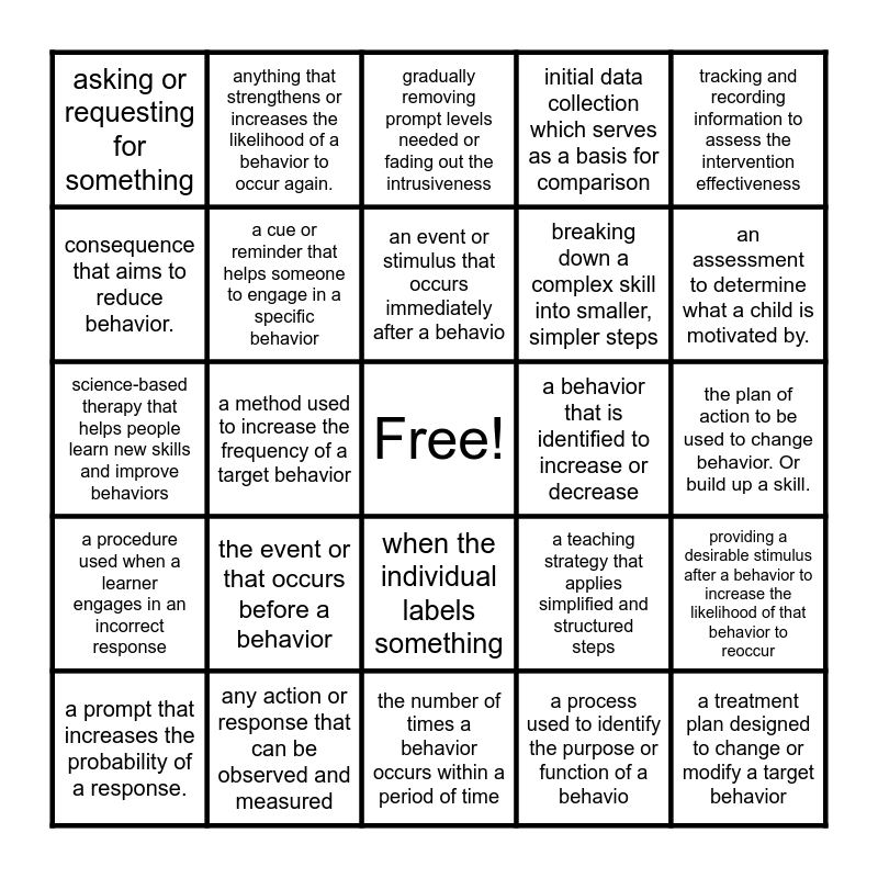This bingo card has a free space and 24 words: the event or that occurs before a behavior, any action or response that can be observed and measured, an event or stimulus that occurs immediately after a behavio, a prompt that increases the probability of a response., tracking and recording information to assess the intervention effectiveness, asking or requesting for something, consequence that aims to reduce behavior., anything that strengthens or increases the likelihood of a behavior to occur again., a behavior that is identified to increase or decrease, when the individual labels something, breaking down a complex skill into smaller, simpler steps, science-based therapy that helps people learn new skills and improve behaviors, a teaching strategy that applies simplified and structured steps, providing a desirable stimulus after a behavior to increase the likelihood of that behavior to reoccur, a cue or reminder that helps someone to engage in a specific behavior, a process used to identify the purpose or function of a behavio, the plan of action to be used to change behavior. Or build up a skill., gradually removing prompt levels needed or fading out the intrusiveness, an assessment to determine what a child is motivated by., a method used to increase the frequency of a target behavior, a treatment plan designed to change or modify a target behavior, a procedure used when a learner engages in an incorrect response, initial data collection which serves as a basis for comparison and the number of times a behavior occurs within a period of time.