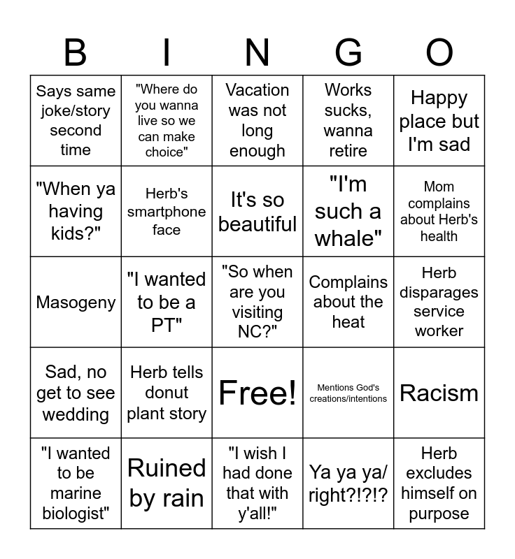 This bingo card has 26 words: Free!, Ya ya ya/ right?!?!?, It's so beautiful, Ruined by rain, Happy place but I'm sad, Says same joke/story second time, "When ya having kids?", "Where do you wanna live so we can make choice", Herb disparages service worker, Mentions God's creations/intentions, "I'm such a whale", Masogeny, Racism, "I wanted to be marine biologist", "I wanted to be a PT", "Things aren't the way they used to be!", Works sucks, wanna retire, Sad, no get to see wedding, Vacation was not long enough, "So when are you visiting NC?", Mom complains about Herb's health, "I wish I had done that with y'all!", Complains about the heat, Herb tells donut plant story, Herb's smartphone face and Herb excludes himself on purpose.