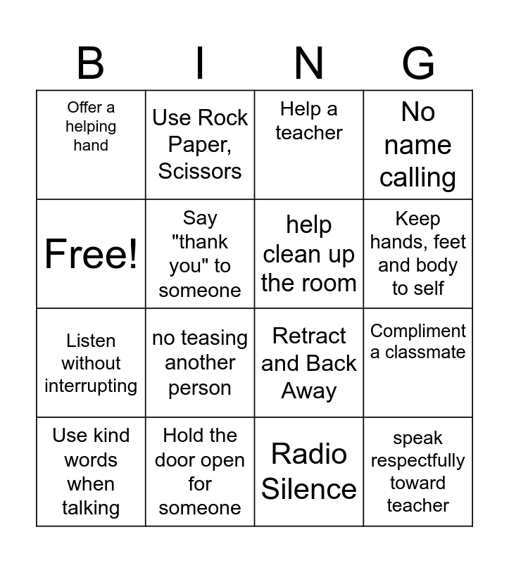 This bingo card has 16 words: Hold the door open for someone, Compliment a classmate, Help a teacher, Offer a helping hand, Listen without interrupting, Use Rock Paper, Scissors, Retract and Back Away, Radio Silence, Free!, Say "thank you" to someone, Use kind words when talking, No name calling, no teasing another person, Keep hands, feet and body to self, help clean up the room and speak respectfully toward teacher.