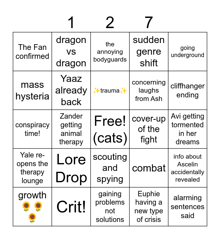 This bingo card has a free space and 24 words: Lore Drop, Crit!, ✨trauma✨, growth 🌻🌻🌻, going underground, The Fan confirmed, mass hysteria, dragon vs dragon, cover-up of the fight, scouting and spying, concerning laughs from Ash, conspiracy time!, combat, info about Ascelin accidentally revealed, Yaaz already back, Euphie having a new type of crisis, Avi getting tormented in her dreams, the annoying bodyguards, cliffhanger ending, Zander getting animal therapy, alarming sentences said, Yale re-opens the therapy lounge, sudden genre shift and gaining problems not solutions.